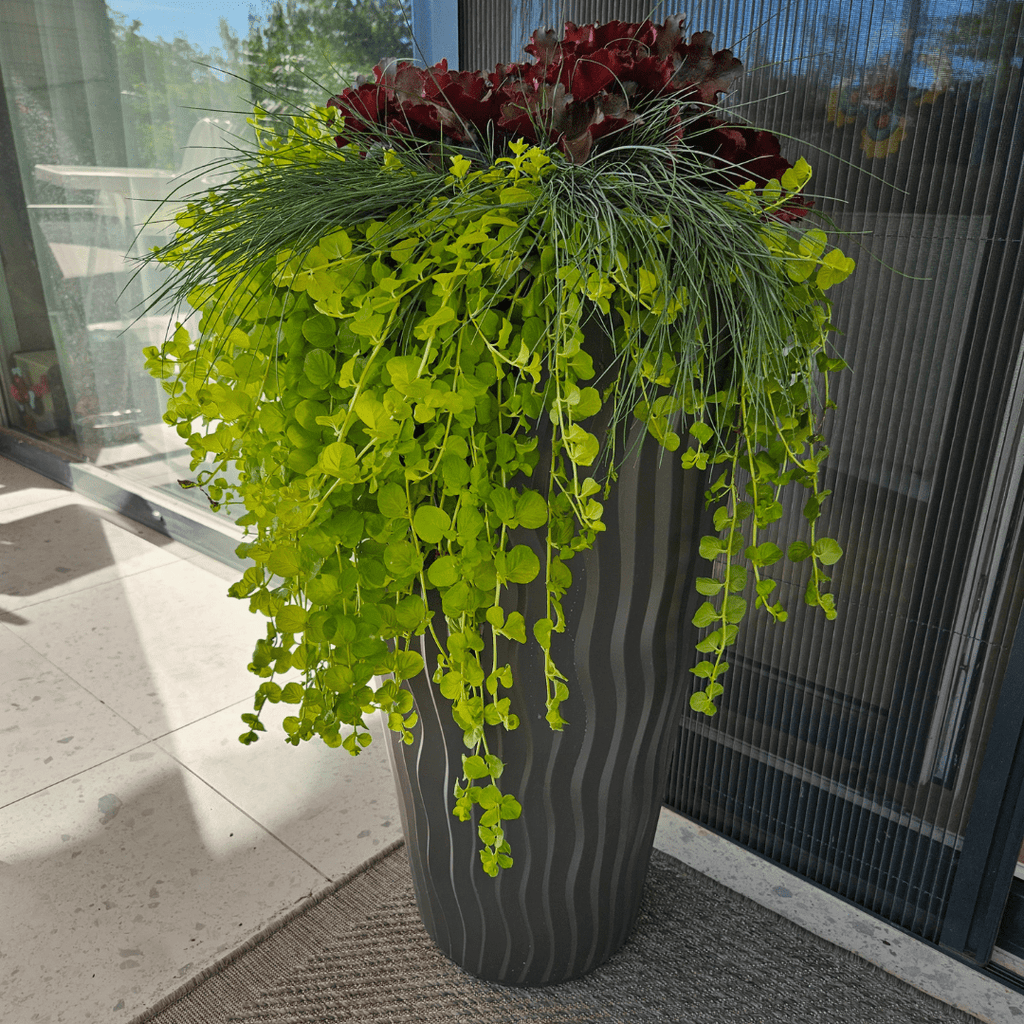 Dekoratív virágtartó modern, sivatagi homokot idéző mintázattal, ültetést segítő betéttel.